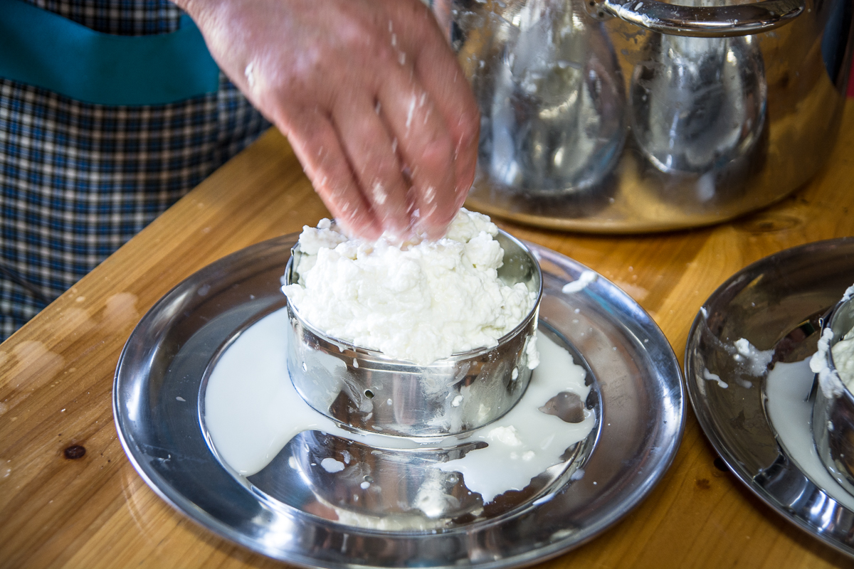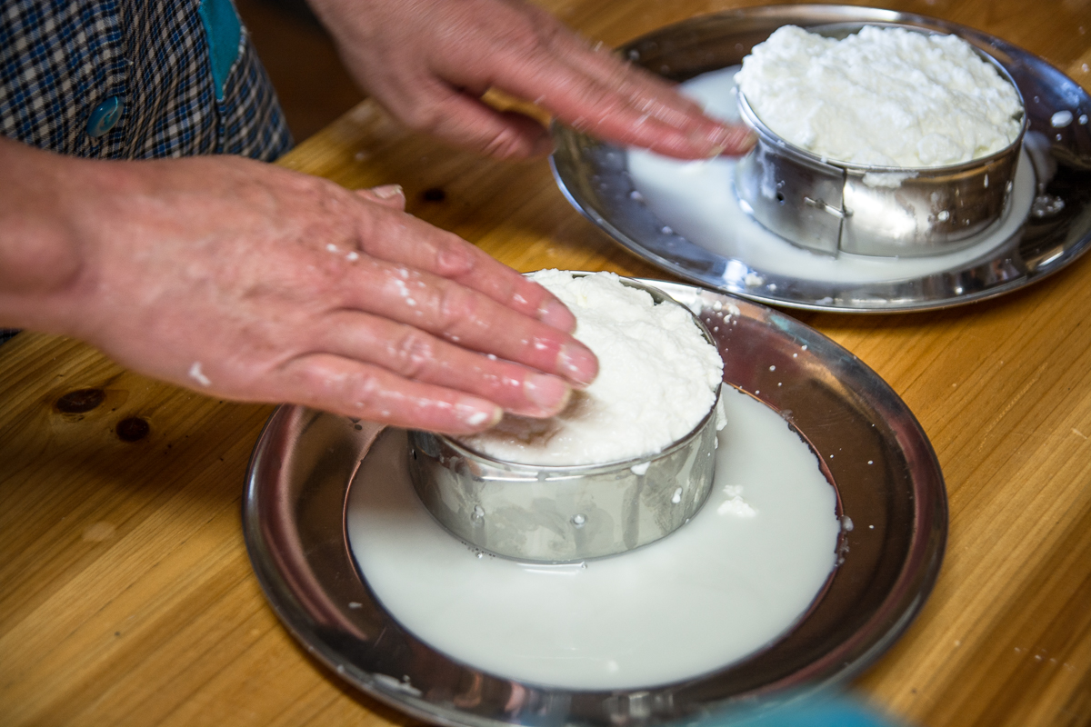 Anschließen wird der Käsebruch in kleine Formen verteilt und gut festgepresst. Nach und nach verliert er hier seine Flüssigkeit und stockt zu einem schmackhaften milden Ziegenkäse. Das braucht einige Zeit.