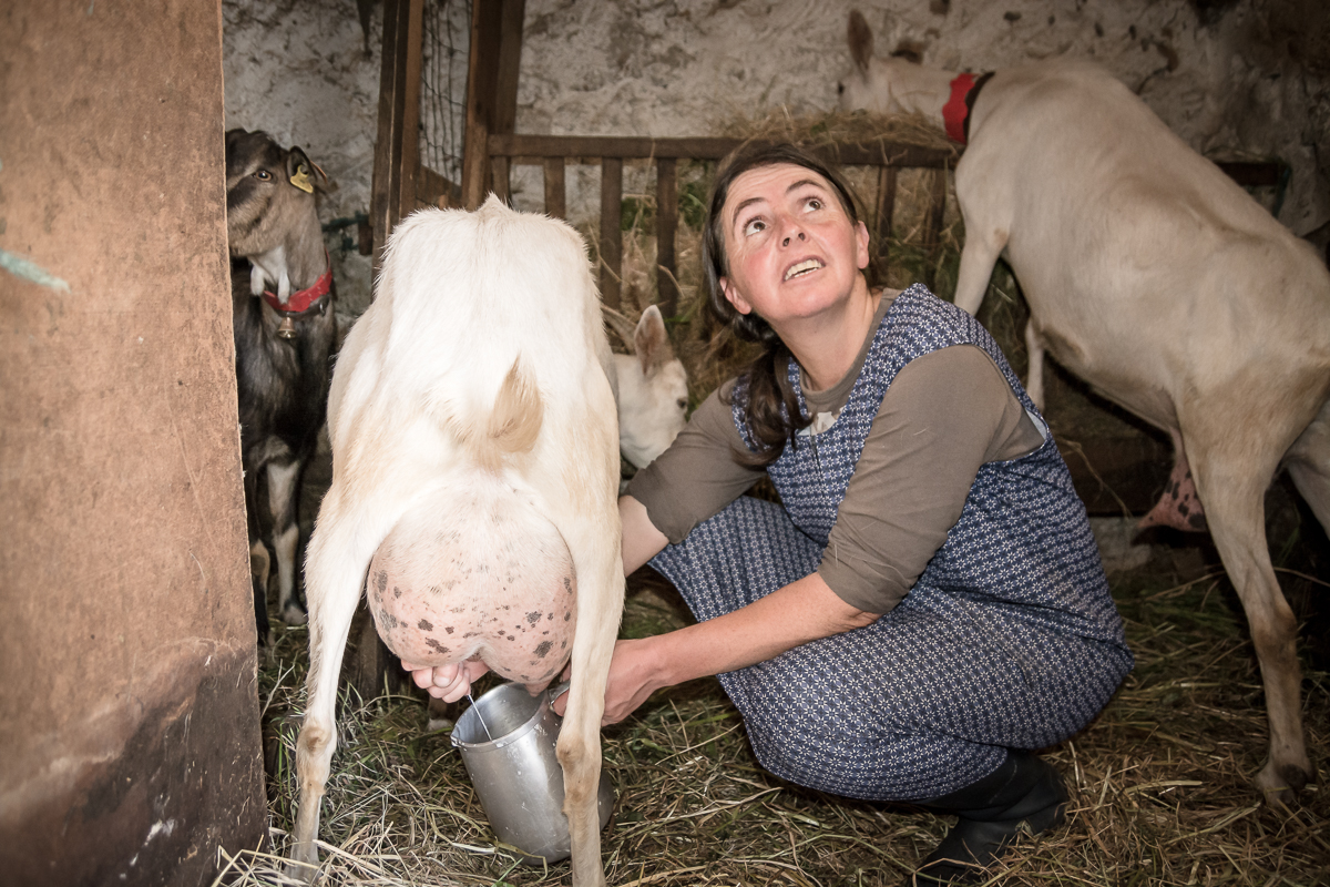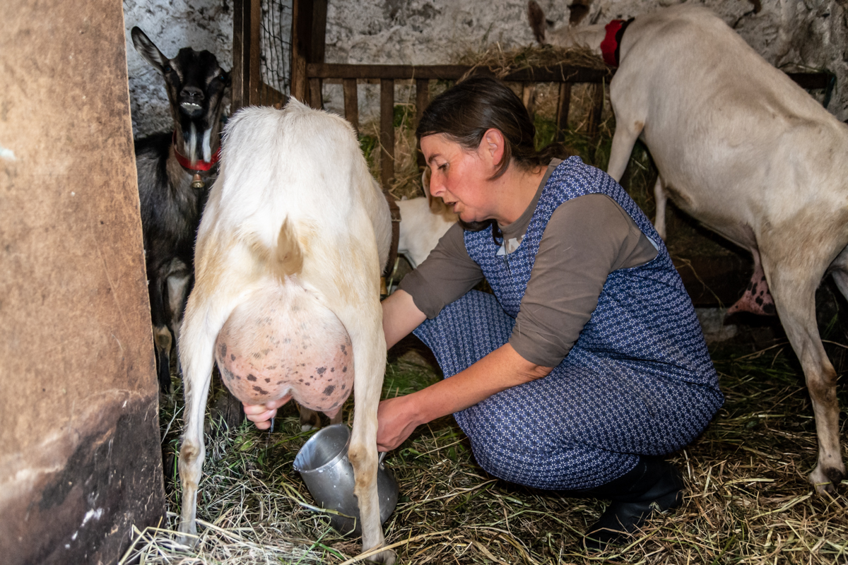 Und so kommt es, dass Fatima ihren Käse immer öfter unter den neugierigen Augen von Gästen oder Schulklassen macht. Wie jeden Tag geht sie auch an diesem Tag in den Stall zu den Ziege. Die sind mal zickig, mal nicht“, erzählt sie und lacht verschmitzt. Der alte Ziegenbock wacht wie immer mit Argusaugen über die Prozedur und gibt lautstark seinen Kommentar dazu.