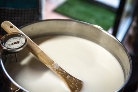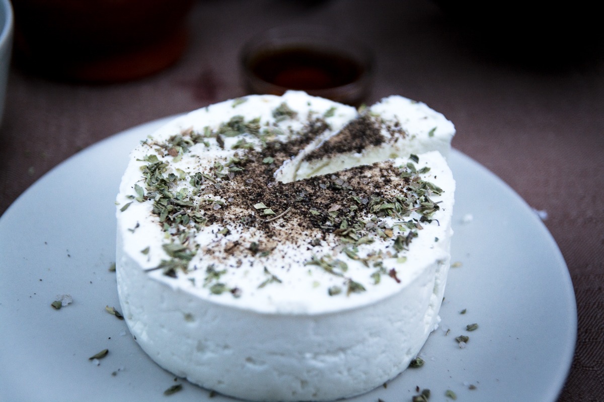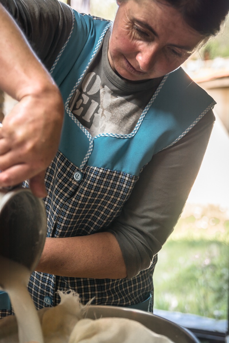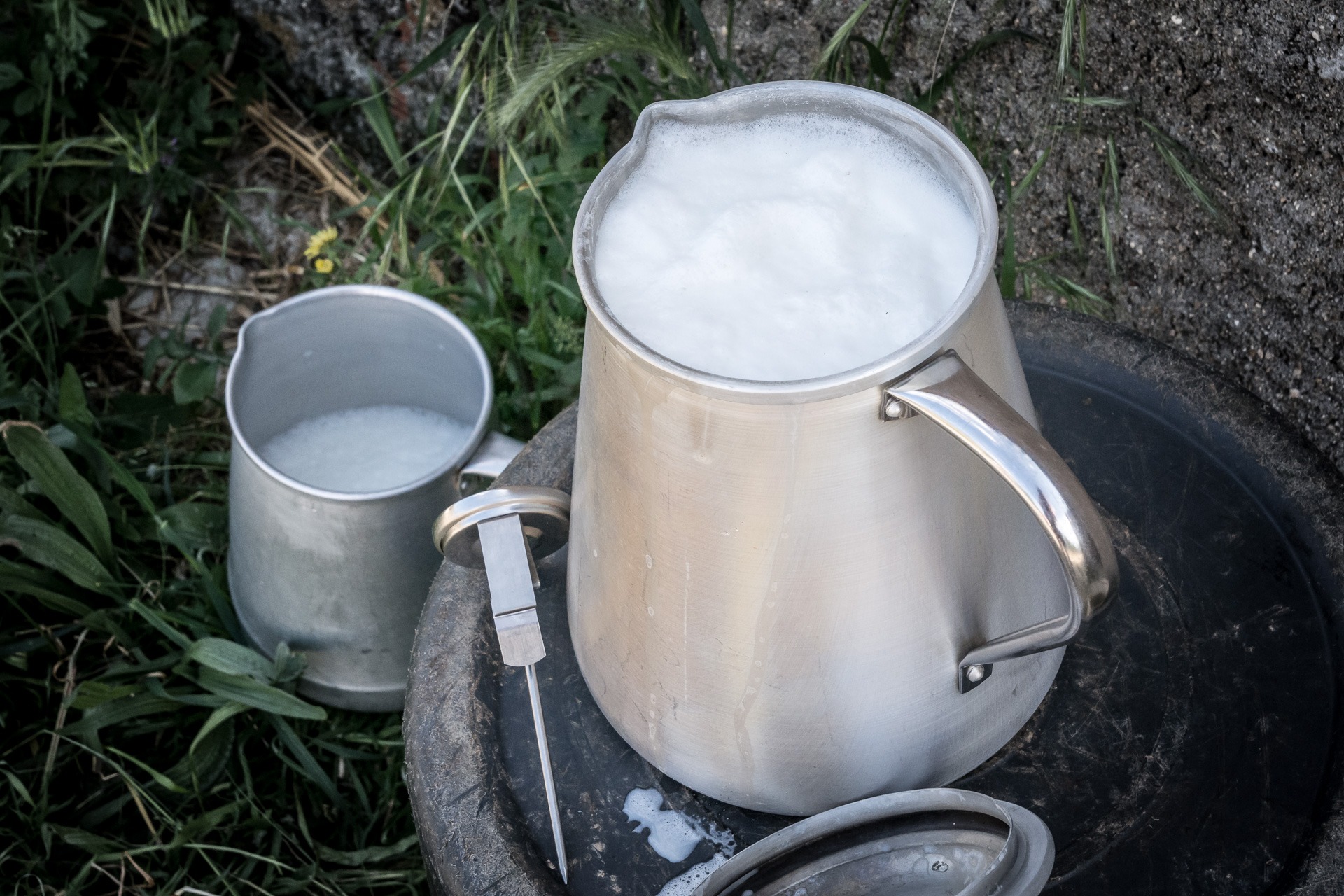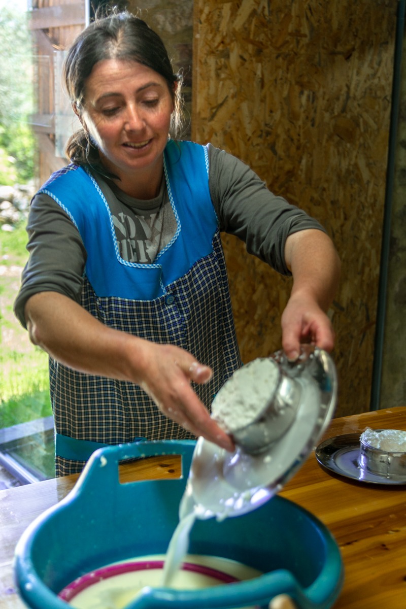 Fatima hat inzwischen ausreichend Milch für ein paar Käse gewonnen. Im Dorfhaus wird die Milch ganz sachte und langsam auf gut 70 bis 80 Grad erhitzt. Unter ständigem Rühren. Fatima ist die Ruhe selbst und hat ein herzliches Lachen, während sie die vor den staunenden Städtern so in ihrem Topf rührt. Nachdem sie den Lab hinzugesetzt hat, wird der Topf in einen dicken Stoff gewickelt. Jetzt wird aus der Milch der Käse.